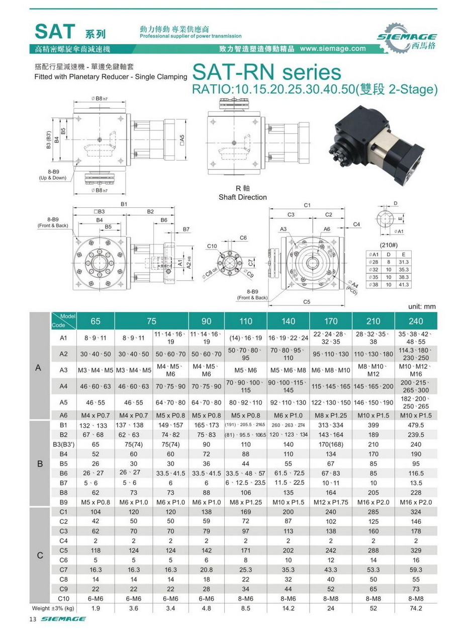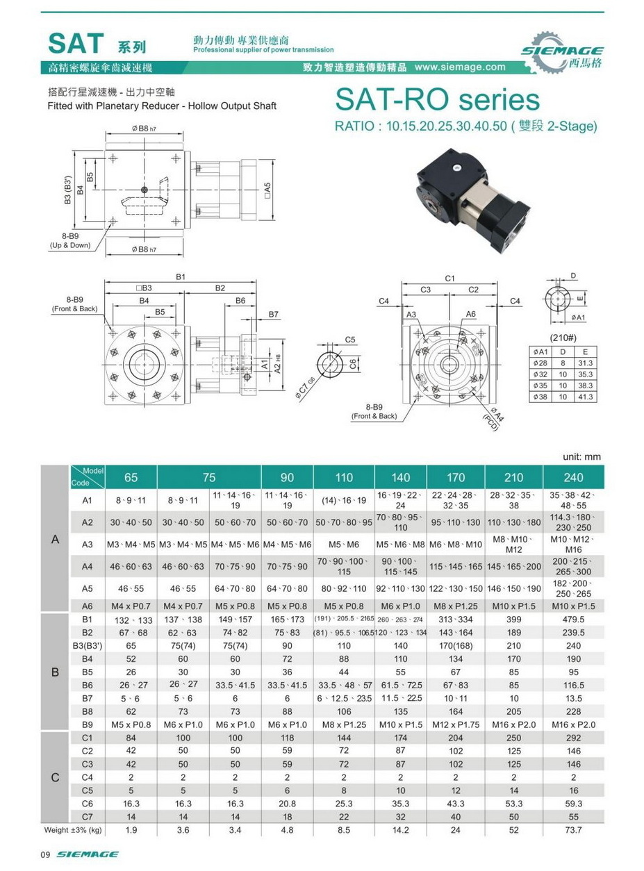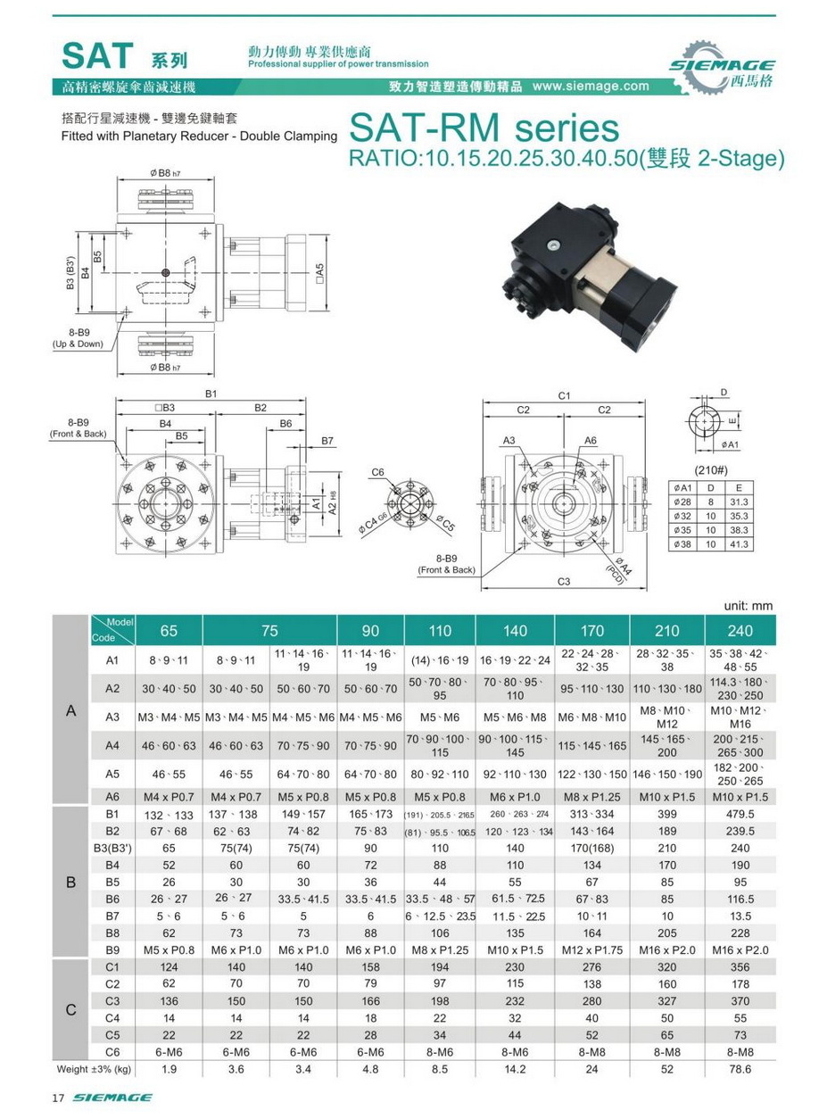 螺旋锥齿轮减速器双段的型号有SAT65,SAT75,SAT90,SAT110,SAT140,SAT170,SAT210等,减速比有1:10,1:15,1:20,1:25,1:30,1:40,1:50等,入力可配各种伺服电机,步进电机,直流电机等。螺旋锥齿轮减速器双段入力轴及出力轴均可特殊加工,订制,满足各种需求。